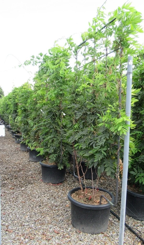 Blauwe regen gekweekt op een ijzeren leirek Dit soort Blauwe regen ‘Yokohama Fuji’ heeft een zeer rijke bloei met korte, paars/violetkleurige, bloemtrossen. De Wisteria brachybotrys ‘Yokohama Fuji’ is aangenaam geurend, heeft lang geveerd blad. Hij is bladverliezend en uitstekend winterhard. Deze blauwe regen is zeer geschikt te gebruiken voor een bloeiende, smalle haag.