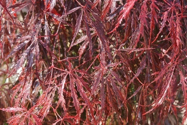 Acer palmatum ‘Inabe-shidare’ is een Japanse Esdoorn met diep ingesneden zwartrode bladeren.