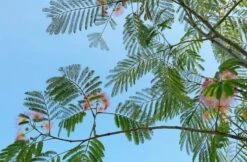 Albizia julibrissin ‘Ombrella’ blijft lager dan de gewone varieteit en groeit met spreidende takken.