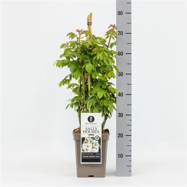 Rosa ‘Sally Holmes’ is een enkelbloemige roos met cremewitte bloemen met een zweem roze. Bloeit opvallend lang en rijk en geurt heerlijk.