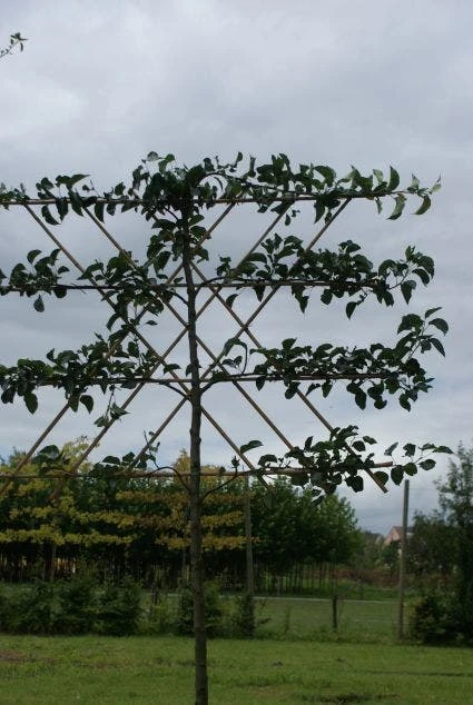 Pyrus calleryana ‘Chanticleer’ als leiboom gekweekt. Deze leiboom krijgt zeer veel witte kleine bloemetjes die soms al in maart aan de leiboom zitten. De bladeren blijven zeer lang aan de Sierpeer als leiboom zitten. In de herfst verkleuren ze ook nog eens naar geelrood. In de zomer zijn de bladeren glanzend donkergroen. Het leirek is 150cm breed en 120cm hoog en heeft vier etage’s. De stam hoogtes zijn van 180 cm tot 220cm hoog, de gewenste hoogte kunt u aangeven bij opmerkingen in de winkelwagen.