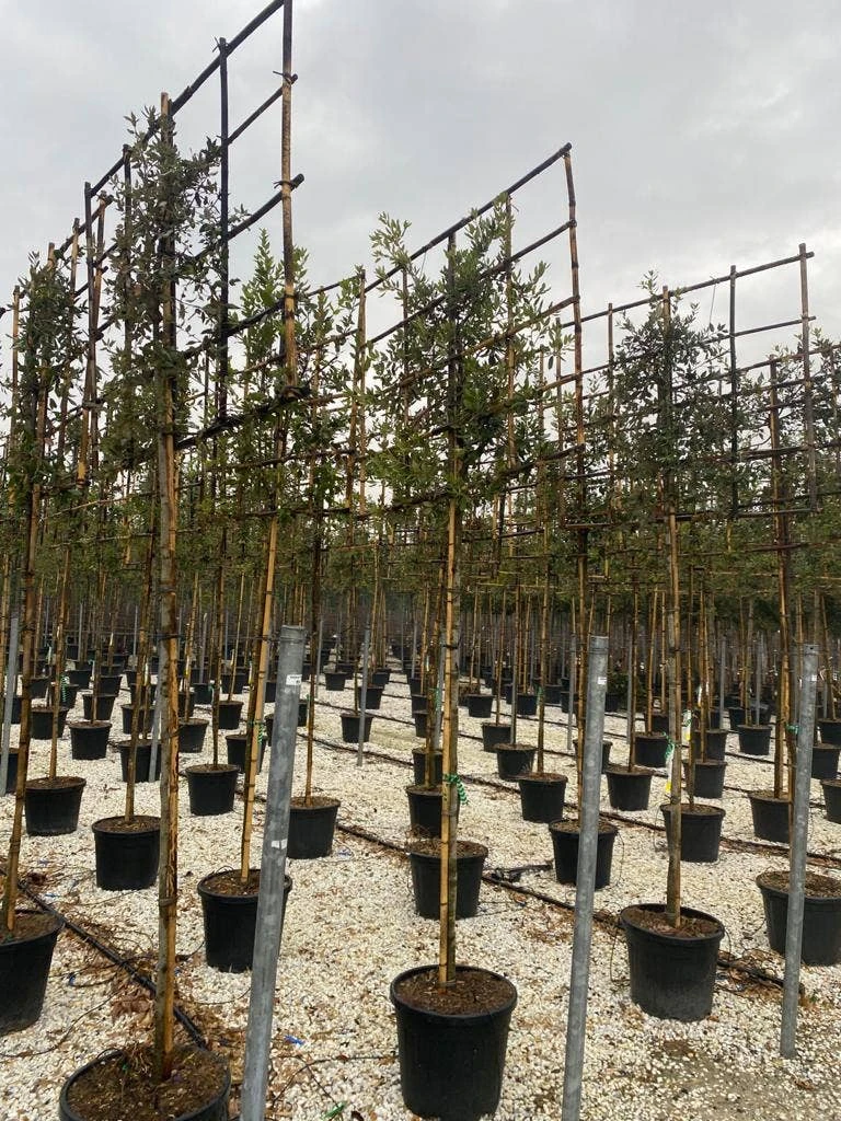 Quercus ilex (Steeneik) is een groenblijvende leiboom die langzaam groeit. Hierdoor hoeft u de boom niet constant te snoeien om hem in model te houden. Deze leiboom heeft een opvallende bast en grijze bladeren. De Steeneik als leiboom is geschikt voor iedere standplaats. De Steeneik als leiboom kan ook goed bij de kust worden aangeplant omdat de Steeneik bestand is tegen de ziltige zeelucht. De Steeneik leibomen die Directplant levert hebben al een mooi vol leirek doordat de bomen al zijn voorgeleid. De Steeneiken met stamomtrek 8/10 cm hebben een stamhoogte van 180cm,waarna het leirek begint. Dit leirek is 130cm breed en 120 cm hoog. Totale hoogte 300 cm De Steeneiken met een stamomtrek van 10/12 cm heeft een stamhoogte van circa 200 cm, waarna het leirek begint. Dit leirek is 150 cm breed en 120 cm hoog. Totale hoogte van deze Steeneik als leiboom is circa 320 cm. Momenteel zijn deze bomen zeer scherp geprijsd!