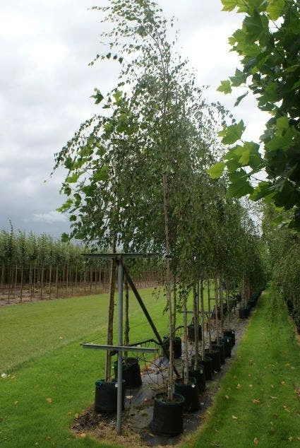 Betula pendula ‘Tristis’ is een Treurberk met doorgaande stam en hangende zijtakken.