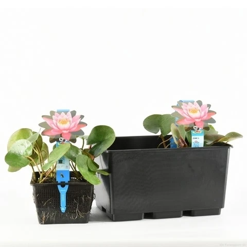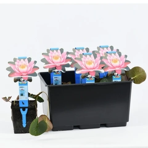 Nymphaea ‘Firecrest’ is een rijk bloeiende waterlelie met roze stervormige bloemen, van juni tot september. Het blad loopt rood uit en wordt vervolgens groen.